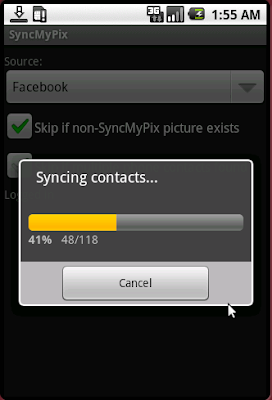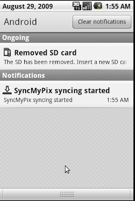 The sync operation takes place in a separate thread, so the UI is free for the user to do whatever they want. If the HOME key is pressed, the user can come back to SyncMyPix by re-launching the application or clicking on the SyncMyPix notification. If the sync is still in progress, the progress bar will be displayed.