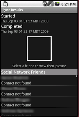 Also, in v0.3, but new since v0.2, is a new sync results interface. It shows when the last sync operation started and completed. It also lets you see the results of the sync and you can view the profile pictures that your friends have set on the social network you are syncing with, whether they were synced successfully or not. Now, this interface is set up well to allow manually adding pictures to contacts where matches were unsuccessful. Look for that feature in a future release.